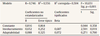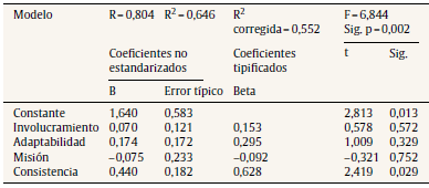 En el modelo de regresión múltiple se obtuvo un valor de F = 10,651 con una significación de p = 0,001, lo que indica que el modelo es viable. Por otra parte, el valor de R2 = 0,556 lo que demuestra es que el 55,6% de la percepción sobre qué tan determinante es la dimensión institucional es provocada por los factores de involucramiento y adaptabilidad. Se observa también un valor para Beta = 0,687 significativo con p = 0,019, indicando que la importancia relativa en el modelo de regresión de la variable involucramiento es del 68,7%, presentándola como la más determinante.