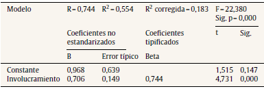Sobre la regresión simple, esta presenta un valor de F = 22,380 con una p = 0,000, lo que indica que este modelo explica mejor la relación entre las variables, en comparación con la regresión múltiple. Asimismo, el factor involucramiento presenta una importancia relativa del 74,4% con una significación de p = 0,000, identificándolo como el más determinante.