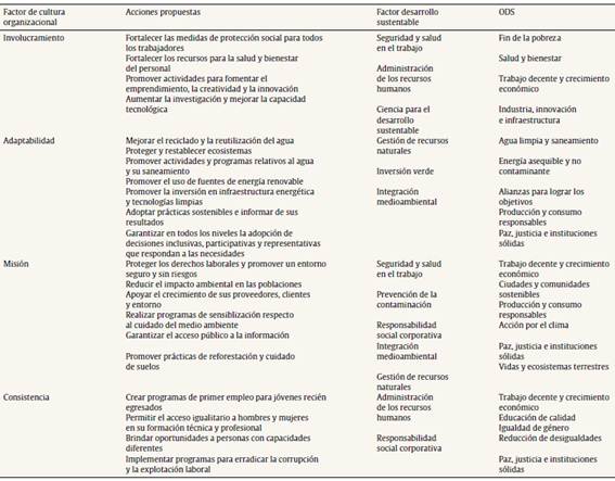 Con base en lo anterior, en la tabla 16 se presenta una propuesta de acciones encaminadas para fortalecer lo que las empresas ya realizan, y para impulsar su desarrollo sustentable con base en los factores de cultura organizacional analizados. Asimismo, se establece en qué dimensión de desarrollo sustentable impacta cada acción propuesta y qué ODS sería alcanzado.