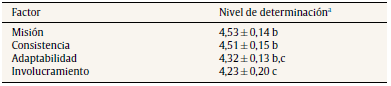 Los resultados muestran un valor de p = 0,056, además de que los factores adaptabilidad y misión también presentan valores de significación mayores de 0,05.