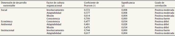 Los resultados obtenidos del análisis inferencial demostraron que los factores de la cultura organizacional sí influyen significativamente en el desarrollo sustentable de las empresas de cerámica, por lo cual, la hipótesis de investigación planteada se acepta.