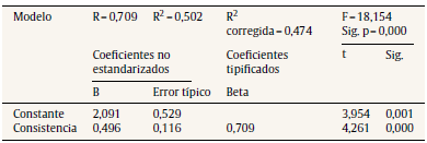 Los resultados del análisis de regresión revelaron que el factor consistencia influye significativamente en la dimensión social por la importancia que tiene para las empresas el que el personal tenga la capacidad de llegar a acuerdos en temas de suma importancia, especialmente en la administración de recursos humanos; además de trabajar en conjunto con otras áreas para alcanzar los objetivos establecidos, mostrando ética profesional y conociendo y haciendo suyos los valores centrales de la organización.