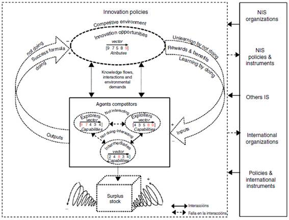 The dynamics of learning and unlearning are presented through rules of decision-making, which are defined as the behavior (search for agents such as proximity and complementary partners and eventual establishment of alliances) for which interactions between agents happen in an innovation system. Interactions occur through two mechanisms or rules of decision-making: the first one is called localization distance or relational proximity distance between agents, defined as the shortest relational distance separating agents for their interactions. The second rule is called distance of complementarity in capacities, defined as the shortest distance between the level of the innovative capacities of the agents; for example, if the capacity level of an agent is lower than the level of attribute of innovation demanded by the market, the agent will seek a partner capable of fulfilling said level of capacity, which could be called satisfaction of the market or environment demand. This procedure is what generally generates multiple mechanisms to make up labor division and productive chains in innovation system.