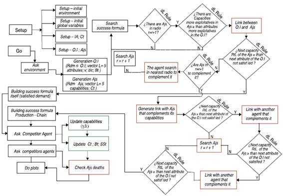 Interactions and rules of decision-making between agents are given through the two mechanisms mentioned in the theoretical framework. The first of them is the relational distance between agents and the second one is the distance of complementarity of capacities. Based on these two rules, offers by competing agents are built, as follows: once a competing agent interacts with the demand for the localization mechanism, the second interaction mechanism is initiated. This consists in comparing the magnitudes of both vectors (from right to left ''RtL''); if the capacity vector is larger or equal in its last position to the demand's attribute vector, demand will be visible for the competing agent and the comparative process will be repeated between the following positions (from right to left ''RtL'') among the agents' vectors. If a competing agent presents equal or comparatively larger magnitudes in relation to the demand's attribute vector in all positions, then it will have set a success formula and it will be able to build an offer by itself.