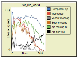 Agents that do not interact or participate with any of the five capacities for building demand will have little or no probability of learning and surviving in the system. This scenario is a result of the inability of agents to generate benefits and counter the cost of maintaining their capacities available. Innovation system showing prolonged unlearning dynamics without generating enough returns will reflect a precarious economic performance that will manifest in the decrease in surplus stock (SS) of competing agents and their later disablement. On the other hand, those who participate in one or more demands with their capacities will have a better probability of surviving in time. Figs. 3 and 4 represent the behavior of agents that survive, as well as the economic performance of the system in a 50-year period.