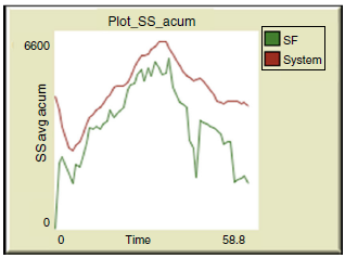 When competing agents adopt equal learning and unlearning factors, for example, δ = 0.3, there is evidence of accumulation of capacities of the agents and a negative variation, which might be explained because some agents learn specific capacities while other unlearn said specific capacities, responding to the demand collectively through labor division, which leads to specialization. It is worth mentioning that these factors represent the accumulation or deaccumulation paths that the capacities of a competing agent may take within a given period. The accumulated SS of the competing agents supplying the demand reflects an economic performance similar to all the competing agents in the system that are incapable of responding to the demand and which are therefore deaccumulating their capacities. That is to say, few competing agents respond to the demand; however, these few are generating enough benefits that reflect on the system's economic performance and its survival.