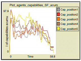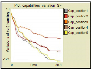 Fig. 6 shows how the system's agents accumulate capacities in certain positions; positive accumulation reflects learning by way of learning by doing and learning by interacting, reflecting thus the good economic performance in the system's cumulative SS.
