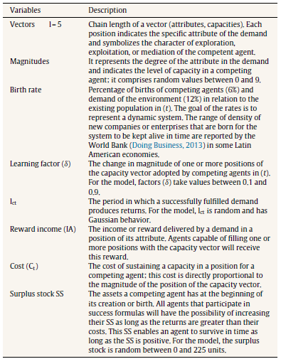 The model requires certain specific attributes like, for example, strict demands. These demands propitiate in some agents the impossibility of interacting (as a result of very low levels in their capacities), and therefore, the deaccumulation of capacities and unlearning. Dynamics of both learning and unlearning make it possible to find out how economic performance is generated in innovation system agents. Agents that are not capable of responding successfully to the demand through the construction of an offer, either autonomously or through interaction with other competing agents, will deaccumulate their capacities giving way to unlearning. It is worth highlighting that unlearning also enables agents to learn other capacities or positions as time goes by, which may facilitate interaction of the competing agent to participate in the demand propitiated by the competitive environment agent, as long as their assets or SS are enough for their survival. Table 2 presents the most significant variables of the calibrated model and their description.