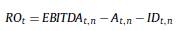 c) La proyección del resultado operativo: primero debe proyectarse el EBITDA t en moneda de cierre. Este es calculado de la suma algebraica de las magnitudes monetarias proyectadas en términos nominales, IT t,n – CAV t,n – CFT t,n . En la siguiente ecuación, R Ot representa al resultado operativo después de impuestos. Este surge de restar al EBITDA t la amortización en moneda de cierre (A t,n ) y el impuesto a las ganancias proyectado determinado (ID t,n ).