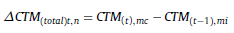 Donde ΔCT representa el incremento total en el capital de trabajo, integrado por la variación de los componentes monetarios ΔCTM y no monetarios ΔCTNM. Respecto de los últimos, cabe destacar dos tratamientos para calcular el resultado por exposición a la inflación. Una primera alternativa consiste en calcular ΔCTM como la diferencia entre la magnitud inicial de cada partida expresada en moneda de poder adquisitivo del ejercicio anterior CTM (t−1),mi y la magnitud final expresada en moneda de poder adquisitivo de cierre (ejercicio presupuestado) CTM (t),mc 16. En este caso la variación total contiene el incremento real (aumento físico) y la variación nominal por exposición a la inflación (resultado proyectado por exposición a la inflación neto, (REI t )).