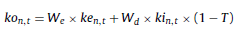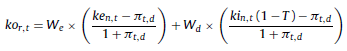 Donde W e y W d representan ponderaciones de las fuentes de financiamiento con capital propio y deuda, ke n,t y ki n,t se refieren al costo del capital propio y de la deuda, siendo T la tasa marginal de impuesto a las ganancias. Aplicando la ecuación de Fisher, el costo del capital propio y ajeno en términos nominales se descompone en ke n,t = ke r,t + π t,d + (ke r,t × π t,d ) y ki n,t = ki r,t + π t,d + (ki r,t × π t,d ). La magnitud CCPP en términos reales se puede estimar de forma directa o indirectamente. El primer camino consiste en deflactar la ecuación 30 (Bradley y Gregg, 2008; Tham y Velez Pareja, 2011) de la siguiente manera: