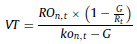 Donde los flujos de fondos libres pueden plantearse en términos de FFLn,t = ROn,t × (1 − tr), siendo tr la tasa de reinversión o porcentaje del resultado reinvertido en el negocio cada año. Surge de la relación entre la tasa de crecimiento de los resultados G y la tasa de rendimiento de la firma Rt, donde G = Rt × tr, siendo la expresión de tasa de crecimiento de mayor difusión. Despejando, en función a la tasa reinversión, se obtiene que tr = G/Rt. Por lo tanto, el flujo de fondos libres es igual a FFLn,t = ROn,t × (1 − G/Rt) y se concluye como resultado en la ecuación 33.