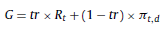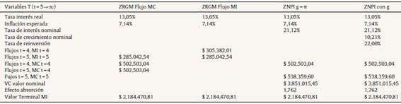 La ecuación precedente explica el crecimiento en términos nominales mediante dos componentes: i) la tasa de crecimiento en los flujos de fondos libres nominales generados por las nuevas inversiones (tr × Rt) y ii) el aumento en el valor nominal del activo fijo de la firma, producido solamente por efectos de la inflación ((1 − tr) × πt,d). Entonces hay dos elementos que conducen el crecimiento de los flujos: el primero es el incremento en los flujos de fondos nominales producto de las nuevas inversiones y el segundo se origina por el revalúo en procesos inflacionarios del capital, cuyo valor aumenta más que la inflación. No obstante, es el segundo término el ignorado por la literatura, especificando la tasa de crecimiento con la clásica expresión G = tr × Rt. Por lo tanto, el efecto de la inflación en la tasa de crecimiento de la firma dependerá de la tasa de reinversión (tr). Si esta es 0 entonces G = πt,d y todo el crecimiento es atribuible a la revaloración de la inversión en activos. Si es > 1 el aumento provocado por activos fijos se ve acompañado por un incremento en los flujos de fondos de nuevas inversiones. La conexión entre tasa nominal y real de crecimiento (g) es la siguiente: G = g + πt,d + g × πt,d, siendo la tasa real g = tr × r.
