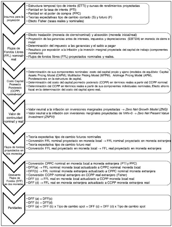 La estructura del trabajo es la siguiente: el punto de partida lo constituyen las teorías de paridad de poder de compra, tasas de interés, expectativas en los tipos de cambio y los modelos de pronóstico de curvas de tasas de interés. A continuación, se analizan las técnicas de proyección correspondientes a magnitudes financieras en moneda inicial y de cierre; determinación del costo promedio ponderado del capital; y cálculo del valor de continuidad neutral a la inflación. Los anteriores apartados son insumos a ser utilizados en la valuación con el descuento de flujos, en dos monedas. Para ilustrar el funcionamiento del modelo se utiliza el estudio de casos como metodología, seleccionándose una empresa en marcha como unidad de análisis, a los efectos de estimar su valor intrínseco con la propuesta metodológica del presente trabajo. Finalmente, se presentan las principales conclusiones obtenidas.