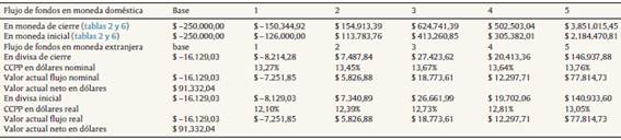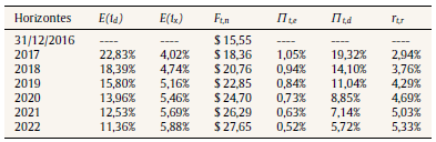 Las variables requeridas por el modelo de descuento de flujo de fondos son: flujos de fondos proyectados correspondientes al horizonte explícito de proyección, la tasa de costo del capital12 y valor terminal (Copeland et al., 2000; Pratt y Grabowski, 2008). La presente sección abordará el tratamiento de la primer variable, la estimación de la medida flujos de fondos en moneda de cierre (efecto traslación, ecuación 16) y en moneda inicial (efecto absorción, ecuación 15).