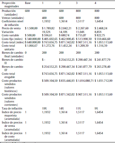 La valuación de las existencias surge del producto entre las cantidades por costo total unitario proyectado: EF q,t × CTP t,n = CTU t,n . El valor proyectado del costo de artículos vendidos (CAV t,n ) es obtenido de multiplicar las proyecciones de ventas y costo total unitario proyectado CAV t,n = CTU t,n × q v,t .