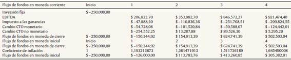 Otra alternativa consiste en expresar las magnitudes iniciales en moneda de poder adquisitivo de cierre; ΔCTM (real)t,n = CTM (t),mc – CTM (t−1),mc . La variación obtenida representa la efectiva inversión incremental o liberación de fondos. En este caso el resultado proyectado por exposición a la inflación se explicita como un componente más en el flujo de fondos proyectados en moneda de cierre (ecuación 24), siendo ΔCTM (total)t,n – ΔCTM (real)t,r = REI t . Para rubros no monetarios (inventarios), la variación real (inversión-desinversión) se obtiene comparando las magnitudes iniciales y finales expresadas en moneda de igual poder adquisitivo ΔCTNM (real)t,n = CTNM (t),mc – CTNM (t−1),mc