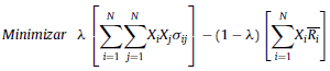 Este modelo es utilizado en la literatura para el análisis y estudio del problema del portafolio. Básicamente, consiste en dos submodelos, frontera eficiente e índice de Sharpe2 (Zhou, Gao, Gao y Zhang, 2003; Chen, Lian y Liu, 2012), donde se incluye un parámetro de aversión al riesgo, el cual se representa a través del símbolo λ, cuyos valores oscilan entre 0 y 1, situación que se plantea en la ecuación 2.