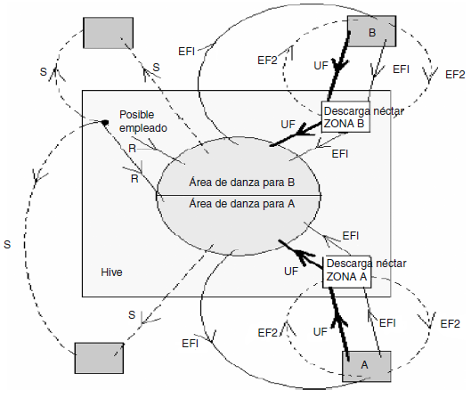 En la figura 1, se muestra el comportamiento básico de las características de las abejas recolectoras. En este caso, se asume que existen dos fuentes de alimentos: A y B. Se debe recordar que en el inicio del proceso las abejas comienzan como desempleadas y no tendrán conocimiento alguno sobre las fuentes de alimentos que hay alrededor de la colmena. De acuerdo a esto, dicha abeja presenta dos opciones: