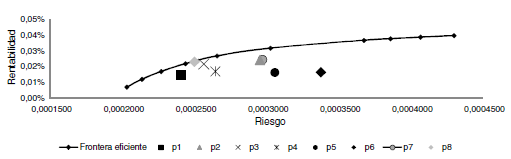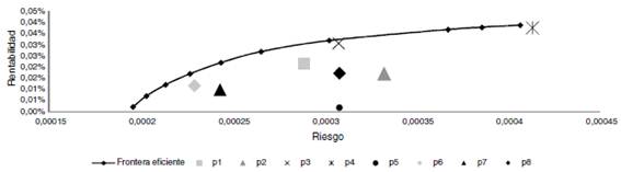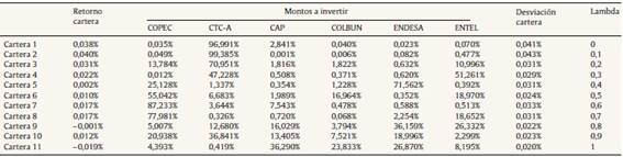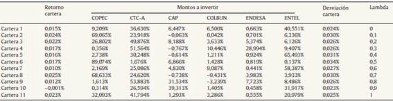 En la tabla 4 se observan los distintos portafolios para cada lambda (λ), de acuerdo al modelo utilizado. Estos resultados no pueden ser comparados directamente con los obtenidos por Gutiérrez y Salgado (2012), de manera que es necesario calcular cuáles fueron los portafolios óptimos para esos mismos niveles de retorno, es decir, cuáles son aquellos que minimizan la varianza y se encuentran en la frontera eficiente.