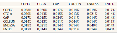 Por otra parte, en la tabla 2, se observa la matriz de varianza y covarianza entre las 6 acciones de la Bolsa de Comercio de Chile.