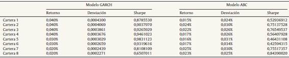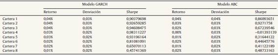 En esta sección, inicialmente se presentan los resultados obtenidos por medio de los modelos GARCH. Posteriormente, se presentan los resultados para la frontera eficiente considerando solo posiciones largas, mediante el algoritmo colonia artificial de abejas. Finalmente, se construye la frontera eficiente con posiciones cortas y largas, utilizando el algoritmo colonia artificial de abejas.