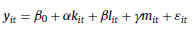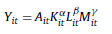 donde Y representa la producción real, A es un índice de progreso técnico Hicks-Neutral y proporciona una medida de la PTF, K representa el stock de capital real, L representa el factor trabajo y M representa los consumos intermedios (o materias primas). Aplicando logaritmos neperianos en la ecuación 1 se obtiene una expresión lineal de la función de producción. Además, realizando esta transformación, los parámetros α, β, γ se convierten en las elasticidades de los factores productivos respecto del output. La suma de estos tres parámetros indicaría el tipo de rendimientos a escala que presentan la función de producción.