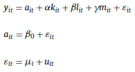 donde y representa el logaritmo neperiano de la producción real, las letras minúsculas k, l, m representan los logaritmos neperianos de los inputs y a representa la PTF (en logaritmos). En este trabajo se supone que este último término se puede descomponer en β 0, que puede interpretarse como el nivel de eficiencia media de las empresas a través del tiempo, y ε it , que puede interpretarse como la desviación de esa media para la empresa i en el periodo t. A su vez, también se supone que el término ε it tiene dos componentes: µ i y u it . En primer lugar µ i , representa la heterogeneidad inobservable. Este término recoge la productividad no observada por los analistas pero observada por las empresas (por ejemplo, intuitivamente, µ i puede estar asociado a la capacidad de gestión en la empresa). En este trabajo se supone que µ i es constante en el tiempo. En segundo lugar, el término u it no es observado ni por la empresa ni por los analistas (es un error aleatorio). Por tanto, la ecuación 2 se puede reescribir de la siguiente forma: