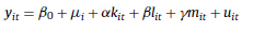 Por tanto, el modelo de la ecuación 3 se puede transformar, ya que las diferencias serían respecto a la media de cada parámetro, por lo que se necesita que los errores y los regresores no estén correlacionados; además, no se puede estimar el efecto con variables constantes en el tiempo, ya que solo se usa variación intragrupos y no entre individuos. Entonces la ecuación 3 se puede re escribir de la siguiente forma:
