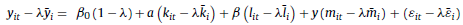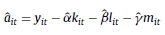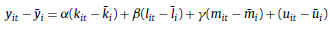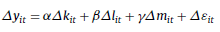 Donde Δy it , Δk it , Δl it , Δm it son, respectivamente, primeras diferencias de logaritmos del output, capital, trabajo y consumos intermedios.