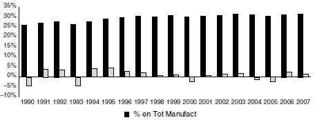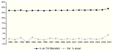 Según la clasificación propuesta por el McKinsey Global Institute (2012), el sector de innovación global en mercados locales aporta alrededor del 31% al valor añadido bruto del total manufacturero español. Además, esta aportación al valor añadido bruto es estable a lo largo del periodo analizado. Para el año 2007 este sector representaba el 31,9% del total del valor añadido bruto de las manufacturas españolas, con una variación interanual del 1,25%. La figura 1 detalla la evolución de la participación de este sector en las manufacturas españolas desde 1990 hasta 2007.
