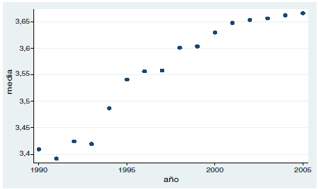 Respecto de la PTF, esta muestra un patrón de crecimiento a lo largo del periodo analizado; sin embargo, cuando se analiza la media de la PTF entre 1990 y 2005, se obtiene que ha crecido tan solo un 7,8% en 15 años; además, entre 2000 y 2005 creció apenas un 1%, lo cual muestra un crecimiento más lento en los últimos cinco años de estudio. El anterior resultado va en línea con Gonçalves y Martins (2016), quienes encontraron que la PTF ha disminuido constantemente desde finales de los noventa para algunos países del sur de Europa, como España, Italia y Portugal. Este efecto de disminución de la productividad se viene dando en las principales economías desarrolladas como un problema de competitividad y poco dinamismo económico.