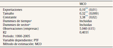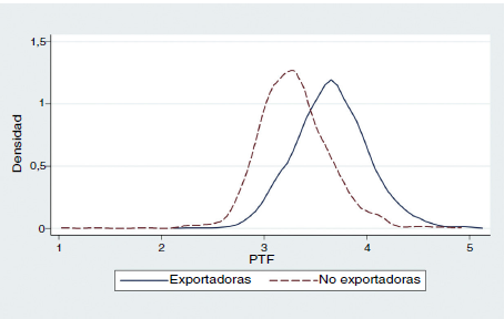 Para corroborar esta información proporcionada por la figura 4 se procede a estimar la relación entre la PTF y la actividad exportadora de las empresas utilizando la ecuación 8. En este caso, la variable X it en la ecuación 8 es una variable dummy que captura si la empresa exporta o no (esta variable es igual a 1 cuando la empresa exporta y es 0 si no lo hace).