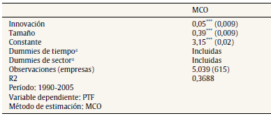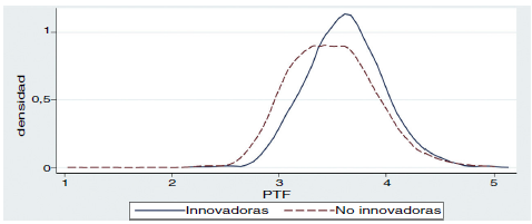 Para corroborar esta información proporcionada por la figura 5 se procede a estimar la relación entre la PTF y la innovación tecnológica de las empresas utilizando la ecuación 8. En este caso la variable X it en la ecuación 8 es una variable dummy que captura si la empresa realiza innovación tecnológica o no (esta variable es igual a 1 cuando la empresa innova y es 0 si no lo hace).