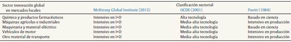 El sector de innovación global en mercados locales está compuesto por 5 industrias: industria química y productos farmacéuticos, máquinas agrícolas e industriales, maquinaria y material eléctrico, vehículos de motor, y otro material de transporte. En la tabla 1 se puede observar la clasificación sectorial de cada industria del sector innovación global en mercados locales propuesto por los diferentes estudios mencionados anteriormente, a partir de lo cual se puede concluir que entre las tres clasificaciones que se comparan no existen muchas diferencias en lo que respecta a la tecnología. En las clasificaciones del McKinsey Global Institute (2012) y de la OCDE (2001) los sectores se encuentran entre intensivos en innovación y media y alta tecnología, dado que son sectores que constantemente innovan y su producción se caracteriza por avances tecnológicos para poder ser vendidos en los diferentes mercados locales e internacionales. Por su parte, el estudio de Pavitt (1984) indica que los sectores basados en ciencia son los que más innovan y desarrollan productos más sofisticados.