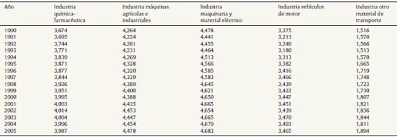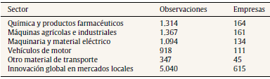 Para este trabajo se dispone de un panel no balanceado (panel incompleto) de 615 empresas y 5.040 observaciones pertenecientes solo al sector de innovación global en mercados locales para el período 1990-2005. En la tabla 2 se muestra la distribución de las empresas y observaciones de todo el sector que se estudia y de las 5 industrias que lo componen: química y productos farmacéuticos, máquinas agrícolas e industriales, maquinaria y material eléctrico, vehículos de motor y otro material de transporte.