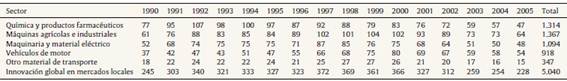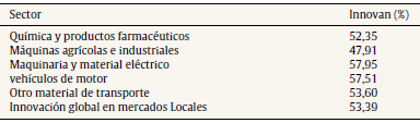 Por otra parte, la tabla 5 muestra el porcentaje de empresas en España que introdujeron alguna innovación tecnológica por industria del sector de innovación global en mercados locales durante el periodo 1990-2005. La industria que más innovó fue la de maquinaria y material eléctrico, mientras que la que menos lo hizo fue la de maquinarias agrícolas e industriales.