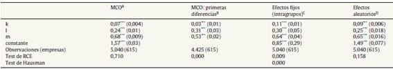 En la tabla 6 se presenta la estimación de la función de producción por diferentes métodos: MCO, MCO en primeras diferencias, MCO efectos fijos intragrupos y MCG efectos aleatorios. En este caso, la muestra es el conjunto de empresas que forman el sector de innovación global en mercados locales de España.