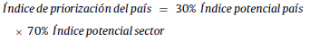 La fase 2, referente a la priorización de países, comprendió una metodología que tuvo como principal objetivo calificar los países preseleccionados según el potencial general de país y el potencial del sector farmacéutico. Dado lo anterior, el resultado era un número índice con valores entre 0 y 1, de tal forma que cuanto mayor fuera este índice, mayor era el atractivo del país para TQ. La composición del índice le da un 30% de peso al potencial del país y un 70% al potencial del sector farmacéutico. Es importante anotar que dentro del índice de priorización de países se escogió al sector farmacéutico como el de mayor peso para evaluar el atractivo de un país. Esto no significa que, una vez tomada la decisión de entrar a cierto país, no se puedan desarrollar otros mercados, pero sí que definitivamente el interés primordial es encontrar mercados donde TQ pudiera desarrollar sus líneas farmacéuticas. De acuerdo a lo anterior, la expresión de la composición del índice de priorización de país es: