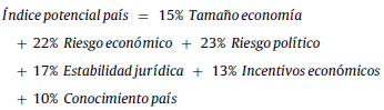 Respecto al índice de potencial país, los criterios y variables utilizados para construir este índice, así como la ponderación de cada uno de ellos, fueron definidos abarcando asuntos críticos de análisis que debieron ser considerados en el momento de realizar inversiones a largo plazo y que permitieron hacerse una idea de los posibles riesgos y costos que trae consigo invertir en un determinado país. El índice de potencial país se calcula como se indica en la siguiente expresión: