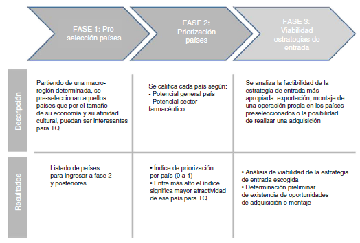 TQ desarrolló una metodología práctica y flexible que le permitió analizar cualquier grupo de países para priorizar y enfocar los esfuerzos de búsqueda de oportunidades de expansión internacional en el negocio farmacéutico. La metodología está basada en una serie de filtros que van permitiendo acotar el portafolio de países con un análisis de la información pública disponible, al mismo tiempo que profundiza en el análisis de los países que van pasando cada filtro. La metodología consta de 3 fases, como se muestra en la figura 1.