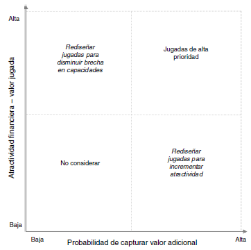 La evaluación de las jugadas se realizó en una matriz de evaluación (fig. 2), con base en 2 criterios, el primero es el atractivo financiero de la jugada, es decir, qué tanto valor le añade esta jugada al negocio de TQ y el segundo criterio es la probabilidad de capturar ese valor incremental que representa la jugada.