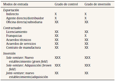 X: mínimo; XX: medio; XXX: alto. Fuente: Adaptación propia de la clasificación de modos de entrada de Root (1994, p. 26).
