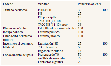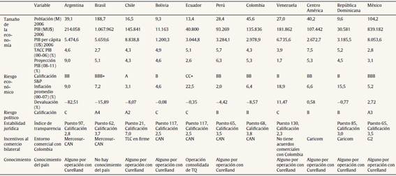 Respecto a la primera fase, relacionada con la preselección de países, hay que considerar que TQ, en la definición de su estrategia de expansión internacional, partió de la base de que inicialmente esta se llevaría a cabo en la región de América Latina. Por esta razón, para la preselección de países se hizo un análisis de todos los países de la región, filtrándolos por el tamaño y la afinidad de los mercados, a partir de lo cual se seleccionaron 10 países de mayor interés (para efectos del análisis se considerará Centroamérica como un ente integrado) (tabla 6).