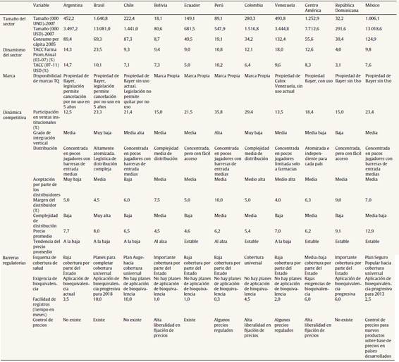 Por otra parte, respecto al cálculo de índice de potencial del sector farmacéutico, la tabla A4 de los anexos presenta los valores de cada una de las variables empleadas para cada país. Con estos valores se obtuvo el índice de potencial del sector farmacéutico (tabla 8), cuyos resultados señalan que los países con mejor potencial del sector fueron en su orden: Brasil, Argentina y Venezuela.