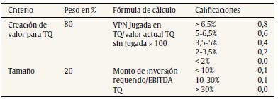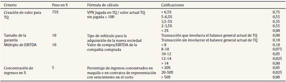 Para las jugadas que involucraban algún tipo de adquisición, el atractivo financiero se evalúa según los criterios y pesos definidos en la tabla 4.