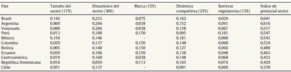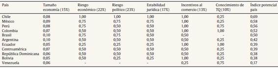 En la segunda fase, en la que se priorizan los países, se realizó el cálculo del índice de potencial país con base en los valores de cada variable para cada país, los cuales se presentan en la tabla A3 de los anexos. Los resultados del cálculo de este índice se presentan en la tabla 7, en donde se observa que son Chile, México y Perú los países con mayor potencial, mientras que Bolivia y Venezuela son los países con menor potencial.