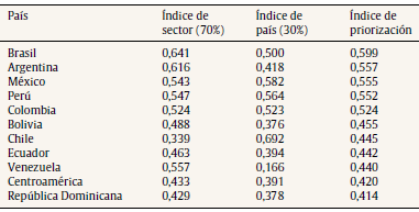 Combinando el índice de potencial país con el índice de potencial del sector farmacéutico, conforme a lo explicado en la sección anterior, se construyó el índice de priorización (tabla 9), cuyos resultados señalan que son Brasil, Argentina y México los países más atractivos.