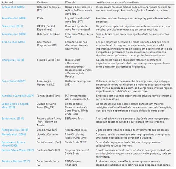 As variáveis primordiais utilizadas na literatura para identificar a restrição financeira são abordadas na tabela 1.