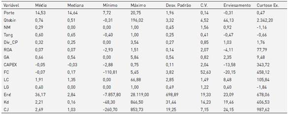 Para identificação de observações atípicas, utilizou-se primeiramente uma análise univariada de todas as variáveis não categóricas, a partir da sua média e desvio padrão. Observações com valores extremos a 2,57 desvios padrões em relação à média foram analisadas individualmente para decidir pela sua exclusão ou manutenção na base (Hair Jr, Anderson, Tatham e Black, 2005). Após a identificação de empresas com comportamentos atípicos, decidiu-se pela exclusão 58 de empresas. Notou-se, para estas empresas que possivelmente a discrepância deve-se à qualidade da informação disponibilizada ou às condições específicas de cada empresa. Na sequência, realizou-se uma análise multivariada com a distância de Mahalanobis e, entre as 10.208 observações, notou-se somente 12 observações atípicas em que se decidiu pela sua manutenção, pois verificou-se que foram alterações de fato na estrutura das empresas.
